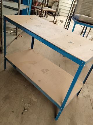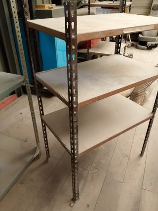Estanterías de dos niveles con estructura metálica y tableros de madera 10€, y 15€ - Ideal para organizar herramientas o materiales. - Diseño robusto y funcional.