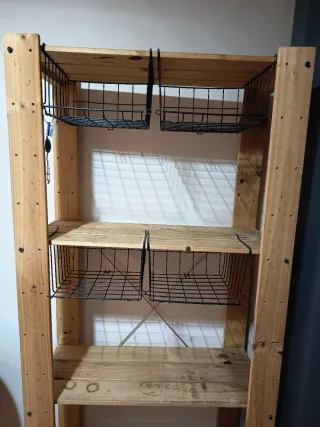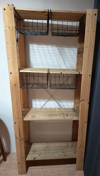 Estantería de madera con un diseño rústico y práctico. Ideal para organizar diferentes espacios. - Estructura principal de madera. - Dos niveles superiores con cestas metálicas. - Dos estantes inferiores de madera. Medidas: 77x1'72m