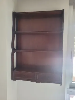 Elegante repisa de madera con un diseño clásico .Válida para cualquier tipo de mobiliario sea clásico o actual .Recogida en mano MEDIDAS: 90cm. ALTO X 60 ANCHO X 16 FONDO. - Tres baldas para almacenamiento. - Dos cajones inferiores para guardar objetos.