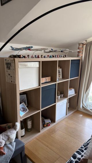 Mueble de almacenaje Kallax de Ikea, perfecto para organizar tu hogar. - Diseño modular y versátil. - Acabado en madera clara.