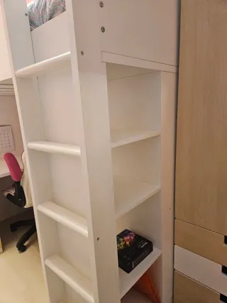Cama elevada con un práctico escritorio integrado y estanterías para almacenamiento. - Escalera de acceso. - Diseño moderno.