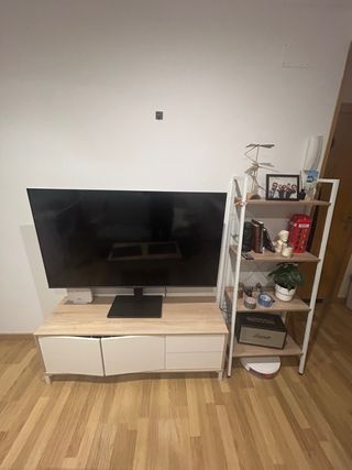 Conjunto de mueble para televisión y estantería. - Mueble de TV con diseño moderno. - Estantería tipo escalera. - Combinación de materiales.