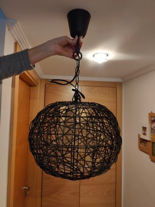 💡Lámpara colgante de color nogal "bola de nudos" en perfecto estado, ideal para cualquier estancia, supuestamente es de salón o salita, pero yo la tuve en una habitación junto a la cocina por ejemplo. 💰PVP: 139€. 📏Medidas 38cm de diámetro y 30cm de altura. 📢Además dispongo de otros muebles como estantería, sofás, mesas, escalera, ventana cierre de aluminio, sillón, butaca, cabecero, sillas, barra cortinas, lámparas ... y electrodomésticos como lavadora, nevera, horno, frigorífico, microondas, campana, lavavajillas, vitrocerámica.
