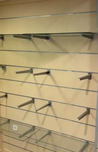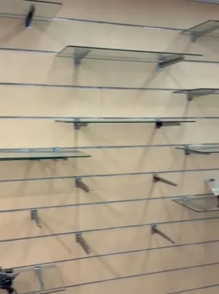 Estantería de pared con baldas de cristal. Góndolas y estantes cristal ,preguntar por todo lote precio de estantes con cartela 20e - Estructura de metal. - Panel de madera.