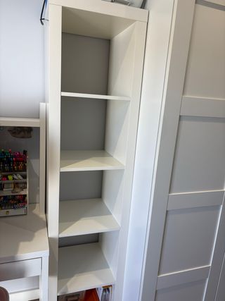 Estantería alta y estrecha de Ikea, ideal para aprovechar espacios. - Diseño moderno y minimalista. - Múltiples baldas para almacenamiento. - Acabado en color blanco.