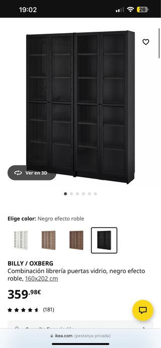 Estantería Billy en color negro, con puertas Oxberg. - Estructura de madera. - Diseño moderno y funcional. - Incluye puertas Oxberg. El precio de la estructura completa en Ikea es de 159,99€