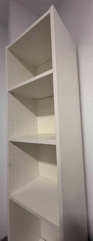 Estantería tipo librero de la marca Ikea, modelo Billy. Solo dispone de las baldas inferior, superior y media, que sujetan toda la estructura del mueble. Por eso el precio, pero el mueble esta en un estado 7/10 diría yo. Los únicos golpes pequeños son en la parte de las patas y a penas se notan. En las fotos son mas visibles porque están hechas de cerca. Las baldas por individual se pueden comprar en Ikea por 14€ cada una o buscarlas con otro vendedor que he visto que esta vendiendo 3 baldas por 30€ aqui en Wallapop (Madrid).