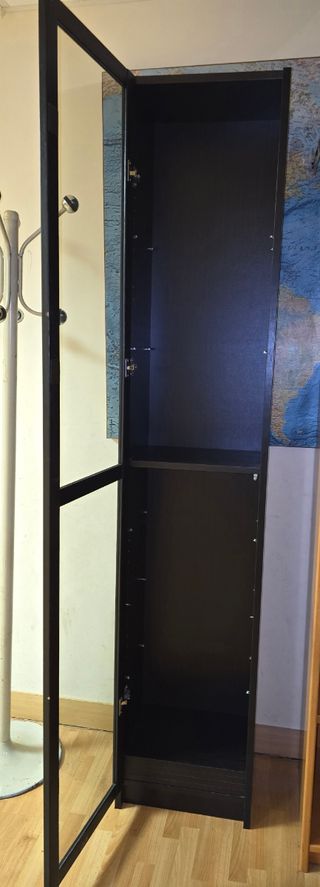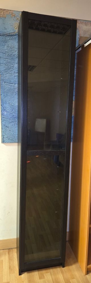 Librería alta de la serie Billy de Ikea con puerta de cristal. - Medidas: 40 cm de ancho, 28 cm de fondo y 237 cm de alto. - Color negro y cristal transparente.