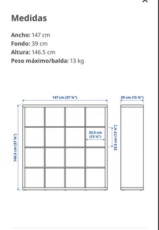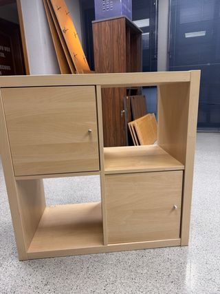 Estantería modular Kallax de Ikea, ideal para organizar tus espacios. - Medidas: 157x157 cm. - Incluye 16 cubos de almacenamiento. - Perfecta para juguetes, libros o decoración. La estantería es funcional, pero está amarillenta sobretodo los laterales (se puede observar en la segunda foto)y tiene varios roces. Es perfecta si vas a cubrir los laterales o si la quieres pintar. La entrego con las 2 puertas y los cajones, pomos no incluidos