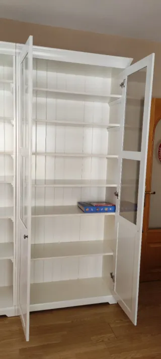 Estantería de 2 módulos, uno con estanterías y el otro con puertas acristaladas. - Estructura principal de madera. - Puertas con paneles de cristal. - Acabado en color blanco. Las estanterías están en Azuqueca de Henares en un tercero sin ascensor, tendrías que desmontarlas tú mismo.