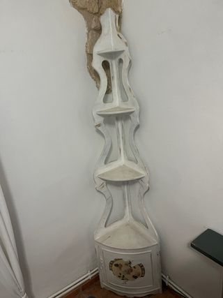 Conjunto de estanterías para organizar tus objetos. - Sujeción a la pared y al techo si se quiere sujetar, lleva unos alambres de cortina - Superficies de madera. - Acabado en blanco