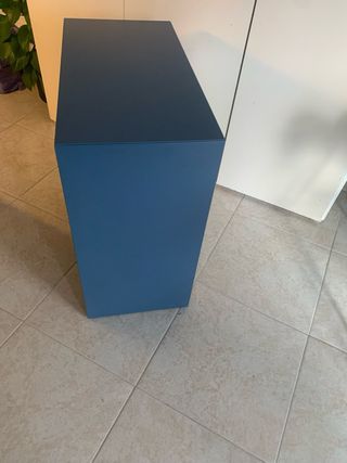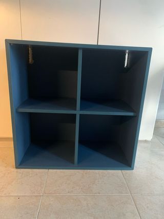 Mueble de almacenaje Eket de Ikea con cuatro compartimentos. - Medidas: 70x70cm. - Color azul. - Material de madera. Cortado por detrás para poder colgarlo en la pared.