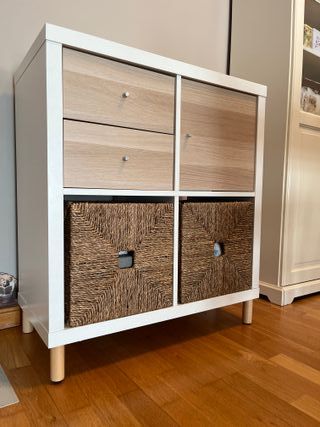 Kallax super bien cuidado, con tal solo un año de vida, con accesorios de puerta, cajones y patas de madera. Desglose del precio de todo lo que incluye comprado nuevo: Kallax 2x2 --> 35 euros Patas de madera --> 20 euros Dos cajas de mimbre --> 30 euros las dos Accesorio de puerta --> 15 euros Accesorio de dos cajones --> 20 euros TOTAL --> 120 euros Lo vendemos por 70 euros, te lo llevas todo montado y muy rebajado como nuevo.