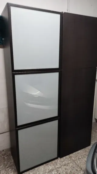 Mueble de almacenaje Besta de Ikea, con un diseño moderno y elegante. En las fotos corresponden con la estantería de la izquierda, la que tiene las puertas de cristales opacos. - Combinación de colores negro y marrón. - Paneles frontales de cristal. - Estructura de madera. Regalo la otra estanteria que se ve al completo que se me cayó en la mudanza y algún daño estético tiene. Es un regalo, no me preguntes por ella para decidirte, si no la quieres la tiro.