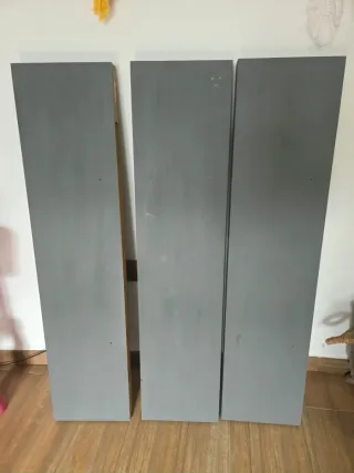 Estante de pared de madera de la marca Ikea. Estan personalizadas, eran color wengué y las pinté por un lado en color gris, los cantos también están pintados en color gris. Tienen sus marcas del uso, de ahí su precio, pero estan servibles o bien volviendolas a pintar (una pintura en spray y quedan bien) o forrar de papel adhesivo. Precio por unidad 4,50€. Si se compran las 3, 12€