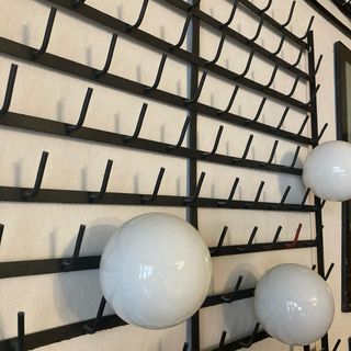 Panel metálico de pared estilo industrial con múltiples ganchos. Ideal para tienda, vestidor, entrada, estudio o espacio comercial. Perfecto para colgar bolsos, accesorios, herramientas, gorras o decoración. Estructura resistente en metal color negro. Diseño funcional y decorativo. Medidas 100x100 cm