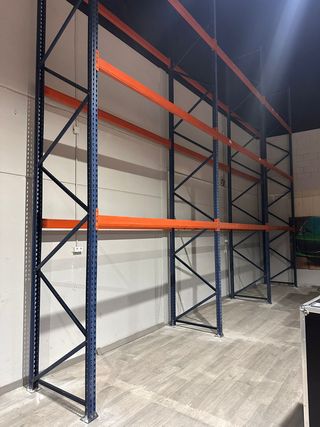 Se venden estanterías industriales de gran capacidad, ideales para almacenes o negocios. - Estructura metálica resistente. - Color naranja en las vigas y azul en los montantes. - Diseño robusto y duradero. - Compramos y vendemos estanterías en toda España - Precios referenciales