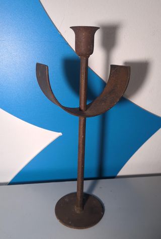 Candelabro de hierro forjado con un diseño artístico y minimalista. Líneas puras y su pátina natural oxidada lo convierten en una pieza perfecta para decoraciones de estilo industrial, rústico o nórdico. Estilo: Brutalista / Vintage. Uso: Ideal como centro de mesa, para estanterías o para crear un ambiente acogedor con luz de vela. Medidas: 30 cm de alto x 12 cm de ancho. Se puede enviar o recoger en Tienda solidaria piel de Mariposa MÁLAGA C/Héroe Sostoa 80 (+ info en la última foto)