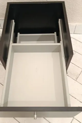 Estantería modular de diseño cuadrado, perfecta para organizar tus espacios. Rozado por el uso de un cajon de tela que acopla. Con el cajon no se ve el roce. Posibilidad de incorporar puerta o cajones comprando aparte en Ikea. Quedaria como la ultima foto - Estructura de madera. - Color negro.