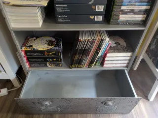Estantería de estilo industrial con un diseño robusto y funcional. Perfecta para organizar libros, cómics y objetos decorativos. - Acabado en metal gris. - Cajón inferior con detalles. -Posibilidad de añadir un cajón lateral incluido.
