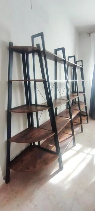 Conjunto de estanterías con un diseño industrial todo nuevo. Estructura de metal resistente. Baldas de madera con acabado rústico.Diseño escalonado tipo escalera. Se trata de 3 estanterías rectas y 2 esquineras. Medidas de estanterías rectas: 173 alto x 53 ancho x 39 profundidad mayor. Medidas estantería esquinera: 161 alto x 64 ancho más grande x 50 profundidad mayor. Se pueden comprar juntas o por separado. Muy fácil montaje. Precio por el conjunto. Entrego en mano desmontadas o también puedo enviar por Correos. Sigue mi perfil para más ofertas y descuentos en compras conjuntas 🛍️
