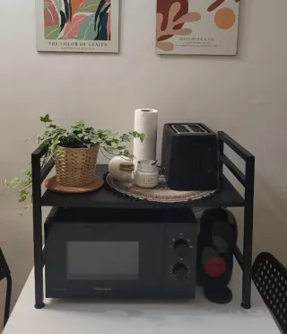 Estante metálico negro de dos niveles ajustable de ancho. Muy útil para poner el microondas, freidora de aire, cafetera, etc... Comprado en Amazon hace un año por 30€.