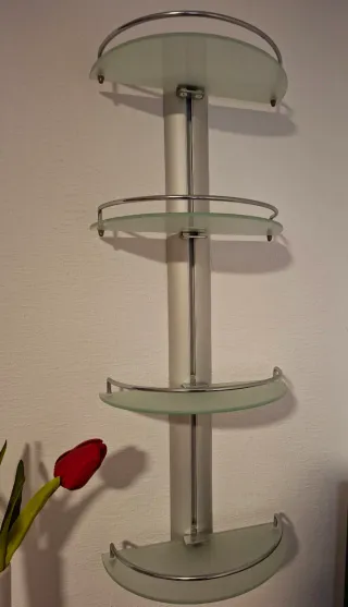Elegante estantería de esquina con un diseño moderno. - Estructura de metal brillante. - Tres baldas de cristal. - Ideal para baños o cualquier rincón.