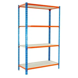 ESTANTERIA METALICA 1800x900x400 MM - 750 KG Estantería metálica en kit fabricada en acero con acabado epoxi poliéster en color naranja y azul. Perfiles de 1,7 mm de espesor y 5 repisas de madera aglomerada de 12 mm de espesor. Soporta una carga máxima (uniformemente repartida) de 750 kilos (150 kilos por balda). Se monta sin tornillos, de manera fácil y rápida. Al no llevar aspas de arriostramiento, tiene acceso libre a todos los estantes. Incluye pies de plástico (que aportan rigidez y evitan el contacto directo de la estantería con el suelo, protegiéndolo de posibles roces) y admite ruedas (no incluidas). Ofrece la máxima cali...