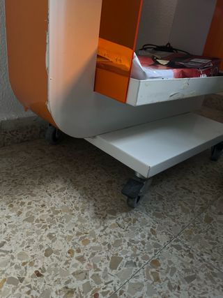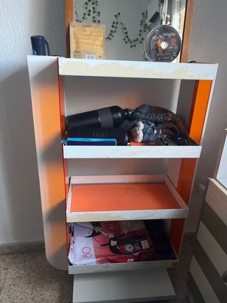 Estantería con un diseño moderno y funcional, ideal para organizar tus objetos. - Estructura principal en metal. - Detalles en plástico. - Color naranja y blanco.