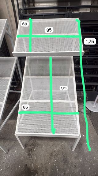 Estanterías metálicas de color blanco. Son perfectas para organizar y exhibir productos. - Diseño de dos niveles. - Superficies de rejilla. - Estructura robusta. 200€ cada una.