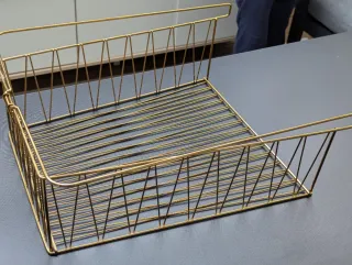 Bandeja de metal con acabado dorado, perfecta para organizar. - Diseño de alambre. - Estructura robusta.