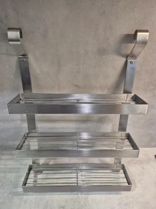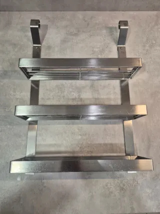 Este colgador de estantería está hecho de metal con un acabado plateado . Tengo dos el precio es de 1 - Diseño de malla. - Se cuelga fácilmente en estanterías.
