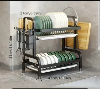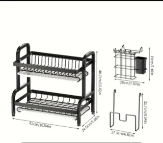 Estantería de cocina de dos niveles con un diseño moderno. - Dimensiones: 42cm x 24.5cm x 40.7cm. - Incluye accesorio para cubiertos y soporte para utensilios. - Soporte adicional para colgar.