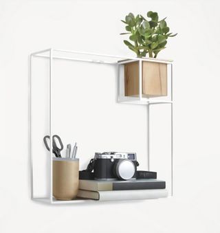 Estanterías modernas con un diseño que combina metal y madera. Las medidas ofrecidas son de la grande. La pequeña mide 38x12x12 cm - Estructura principal en metal blanco. - Cubo decorativo y soporte para maceta en madera. - Diseño minimalista y funcional.