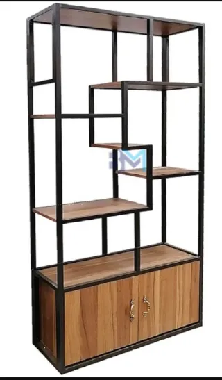 Estantería de diseño moderno con estructura metálica y baldas de madera. - Diseño asimétrico. - Combinación de materiales.