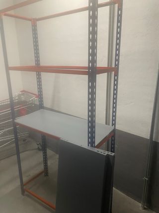Estantería robusta para organizar tu espacio de almacenamiento. Ideal para garajes, trasteros o talleres. - Según aparece en la foto. - No se desmontan, ni se cargan, ni se hacen envios - La persona interesada se tiene que encargar de desmontar y traslados - Estructura principal de metal. - Baldas de madera. - Color gris y naranja.