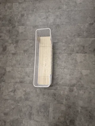 Práctico zapatero de tres baldas para organizar tu calzado. -Tengo tres - se puede poner uno encima de otro - Estructura de madera blanca. - Baldas de metal plateado.
