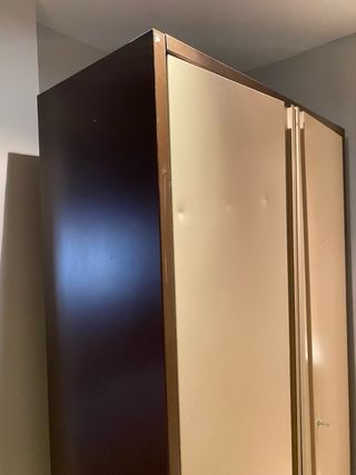 Archivador metálico con estanterías integradas. Su diseño combina tonos beige y marrón para un aspecto elegante. - Estructura robusta de metal. - Varias estanterías para organización.