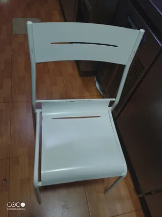 Sillas de metal de color blanco. Tengo 14 unidades, precio cada una 9€ Precio todas 90€ - Diseño moderno con ranuras en el respaldo y asiento. - Patas metálicas delgadas. Hosteleria, mobiliario, decoración, cartel, carteleria, publicidad, mesas, sillas, estantería, pizarra, letrero, luminoso, neon, bandejas, the pink panther, madera, botellero, atrezo, burguer, hamburguesas, hamburgueseria, restaurante, bar, copas, juguete, figura, funko, cromo, Hollywood, hormiga charlie, oso hormiguero, halibut, inspector, interiorista, interiorismo, pelicula