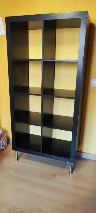 Estantería modular Kallax de IKEA, con un diseño moderno y versátil. - Estructura principal en color negro - Patas metálicas plateadas. En buen estado, con desgaste del uso como se ve en las fotos Va con 4 patas valoradas en 22€, la estantería sola nueva cuesta 60€. NO HAGO ENVIOS. Ver y recoger en Vallecas, metro Miguel Hernandez
