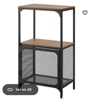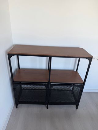Mueble de estilo industrial con estructura metálica y baldas de madera. - Puertas inferiores de rejilla metálica.