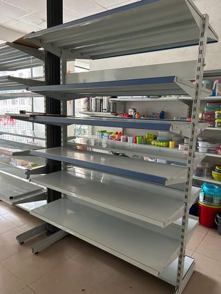 Estantería metálica de 1.30 metros de ancho. Estantería metálica de tamaño mediano con baldas a ambos lados. Medidas : 1.3m de largo x 2 m alto x 85 de ancho. - Estructura robusta de metal se vende con 12 baldas auto-regulables - Estructura robusta de metal. - Detalles en plástico.