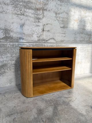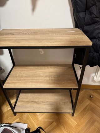 Estantería de diseño moderno con acabados en madera (no es madera de verdad) y metal. 76 altura x 60 ancho x 30 fondo Tiene un daño visible en la foto. - Ideal para espacios reducidos.