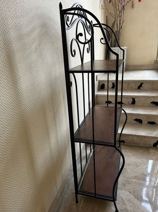 Elegante estantería con un diseño clásico y detalles ornamentales. - Estructura principal en metal. - Detalles decorativos en la parte superior. - Acabado en tonos marrones y dorados.