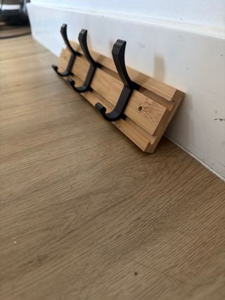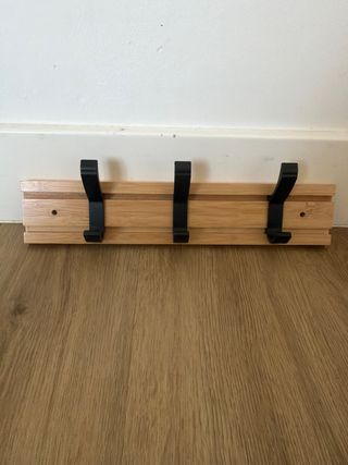 Elegante perchero con base de madera y ganchos de metal. - Diseño moderno y funcional. - Combina madera natural y metal negro. Tamaño 30cmx6cm la base de madera