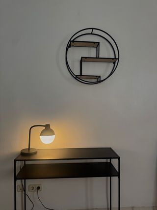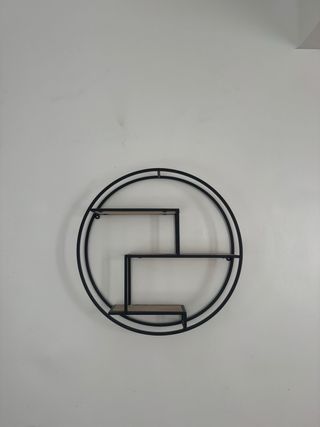 Estantería de pared redonda estilo industrial, estructura metálica negra con baldas de madera. Diseño moderno y decorativo, perfecta para salón, dormitorio o recibidor. En muy buen estado. Recogida en MADRID.