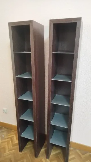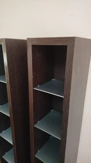 Conjunto de dos estanterías altas y estrechas. - Diseño moderno con estructura de madera. - Estantes metálicas. En las dos se puede ver que el detalle del plástico que sujeta el estante está roto pero las otras las sujetan bien, se ve en la fotografía.