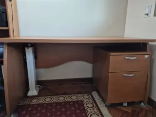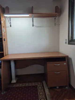 Conjunto de escritorio con cajonera, estantería y silla. - Escritorio de madera. - Cajonera con dos cajones. - Estantería superior con soportes metálicos. - Silla con ruedas