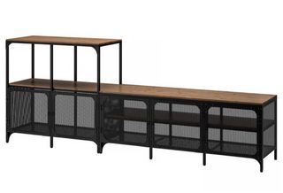Estanterías de pared Fjällbo de Ikea. Combinan un diseño industrial con materiales cálidos. Medidas: Ancho 101 cm Fondo 20 cm - Estructura de metal negro. - Superficie de madera con acabado marrón. Precio en tienda 79,98€
