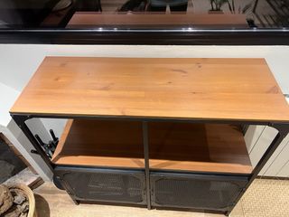 Mueble de televisión con un diseño moderno y funcional, con estantería lateral individual (51x95cm). Disponible el 20/03 - Combinación de estructura metálica negra y superficie de madera. - Estilo industrial y contemporáneo.